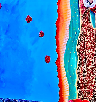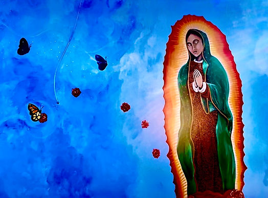 What initially started out as a blank white wall eventually transformed into a space alive with vibrant color. The center piece, Our Lady of Guadalupe accompanied by monarch butterflies, both being symbols of compassion, hope and love are the warm images that welcome all travelers and the local community.